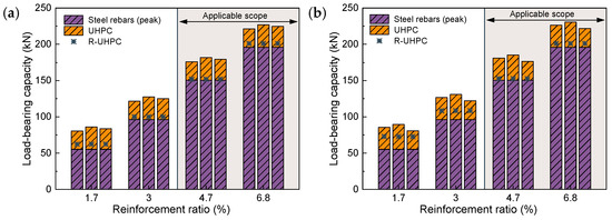 Calculation of the load-bearing capacity of R-UHPC based on the peak strength of steel rebar: (a) fiber volume fraction of 0.5%; (b) fiber volume fraction of 1.0%.