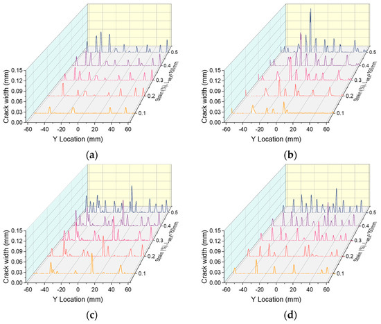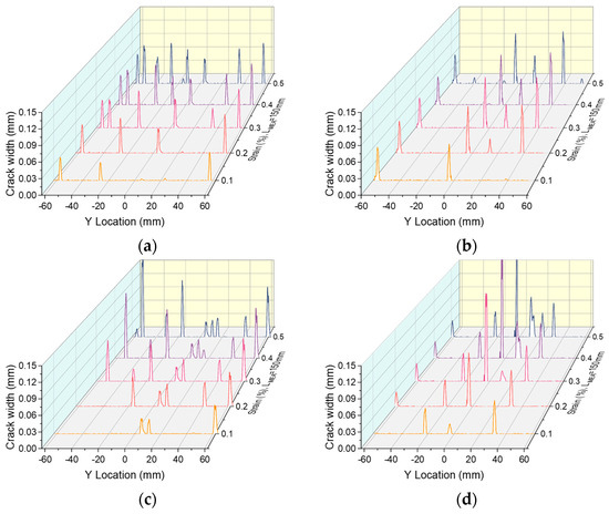 Propagation of maximum crack width in R-UHPC with 0.5% fiber volume fraction: (a) ρ = 1.7%; (b) ρ = 3.0%; (c) ρ = 4.7%; (d) ρ = 6.8%.