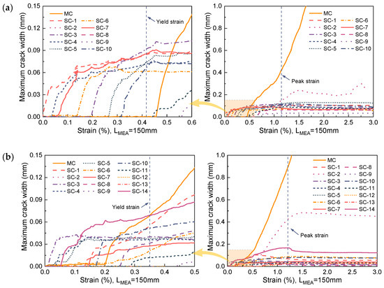 Figure 17 illustrates the typical progression of the width of all cracks on a single R-UHPC specimen in correlation with increasing strain. Broadly, the propagation of crack width in line with escalating strain aligns well with. In the instance of R-UHPC with a 0.5% fiber volume fraction (Figure 17a), as strain enlarges, the first crack appears and rapidly widens until the initiation of the second crack. Following the emergence of the second crack, it swiftly expands, while the growth of the first crack concurrently decelerates until the advent of the third crack. This sequence repeats until the rebar located at the section of a particular crack yields. Once the rebar yields, the width of the main crack (labeled as MC in Figure 17) swiftly expands, during which period, the width of the other cracks ceases to enlarge or increases only marginally with strain increment. After reaching the peak strain, the width of the cracks, apart from the main crack, diminishes with the gradual unloading of the specimen. As can be seen from Figure 17b, after the fiber volume fraction increases to 1.0%, the main crack begins to propagate rapidly before the yield of the R-UHPC, which is due to the heightened fiber volume fraction intensifying the degree of localized deformation of the rebar.