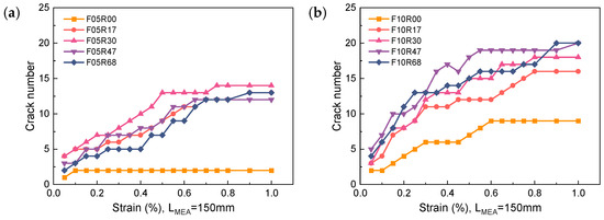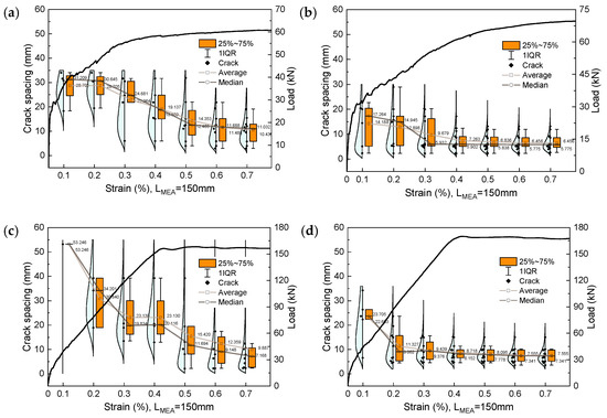 Development of crack spacing: (a) F05R17; (b) F10R17; (c) F05R68; (d) F10R68.