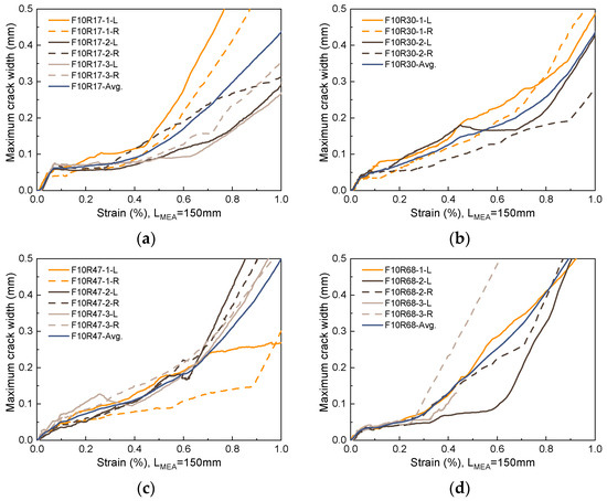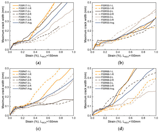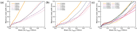 The propagation of the maximum crack width with strain for the unreinforced UHPC is shown in Figure 20. To ensure data representativeness, the maximum crack width data is extracted from the trisection lines on both sides of each specimen. In Figure 20, the label F05R00-1-L refers to data extracted from the left trisection line of specimen F05R00-1. For unreinforced UHPC with a fiber volume fraction of 0.5% or lower, once a crack initiates, its propagation progresses rapidly with width increasing linearly alongside strain increments. In this case, fibers offer minimal restriction to crack propagation, as evidenced by the observed failure mode, where hardly any multi-cracking occurs on either side of the fracture surface. When the fiber volume fraction elevates to 1.0%, the propagation of the main crack with increasing strain is inhibited by the fibers, inducing multi-cracking behavior within a local range on both sides of the fracture surface, as shown in Figure 6. Notwithstanding, due to the varying uniformity of fiber dispersion and fiber orientation, this inhibitory effect is not stable. This instability leads to a high level of dispersion in the progression of the maximum crack width with increasing strain, as exhibited in Figure 20b. Consequently, this poses challenges in accurately predicting the maximum crack width.