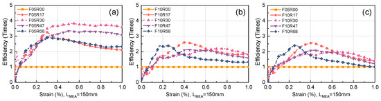 Figure 24c assesses the fiber efficiency in R-UHPC with a 1.0% fiber volume fraction, utilizing unreinforced UHPC with a 0.5% fiber volume fraction as the benchmark specimen. This comparative analysis enables the evaluation of the efficacy of each 0.5% fiber volume fraction increment in 1.0% fiber volume fraction UHPC in restricting maximum crack propagation. Comparing Figure 24a,c, it can be seen that each 0.5% fiber volume fraction in R-UHPC with a 1.0% fiber volume fraction is less efficient in restricting the maximum crack propagation than R-UHPC with a 0.5% fiber volume fraction. Elevating the fiber volume fraction from 0.5% to 1.0% diminishes the fiber efficiency. From the perspective of improving the efficiency of fibers in restricting the maximum crack propagation, choosing R-UHPC with a 0.5% fiber volume fraction and a 3.0% reinforcement ratio is relatively efficient. It is important to emphasize that there is no one parameter combination that gives fibers the highest efficiency across all strain levels. In practical engineering, the appropriate parameters should be determined based on the strain level at which the engineering structure is in service.