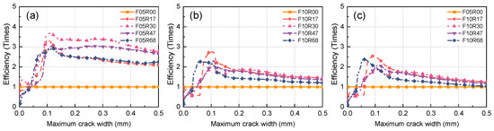 Efficiency of fiber in restricting the maximum crack width: (a) fiber volume fraction of 0.5%, (b) fiber volume fraction of 1.0%, (c) comparison.