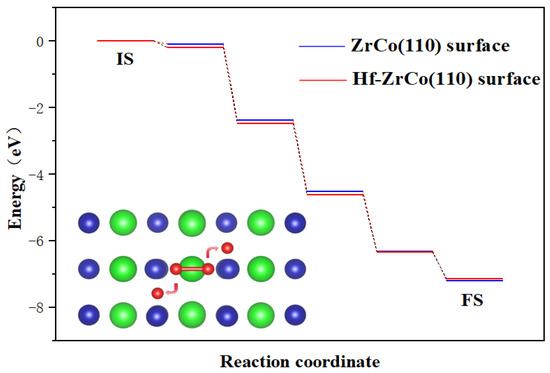 As shown in Figure 3, the dissociation process on the ZrCo(110) surface is exothermic, with a heat release of 7.18 eV, forming a stable structure. There is almost no dissociation barrier, which indicates that the dissociation of oxygen molecules is a spontaneous process, which is in line with the result of Zhang et al. [31]. On the Hf-ZrCo(110) surface, similarly, oxygen molecules undergo spontaneous dissociation, with two oxygen atoms finally stably adsorbed at the H3 site on the surface. That is to say, the doping of Hf will not affect the spontaneous dissociation of oxygen molecules on the ZrCo(110) surface.