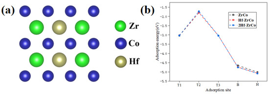 To study the concentration of Hf substitution on the O atom adsorption behaviors, as shown in Figure 4a, we built the 2Hf-ZrCo(110) surface by substituting two Zr atoms with two Hf atoms. Figure 4b shows that, compared with the Hf-ZrCo(110) surface, the O adsorption energy at different adsorption sites on the 2Hf-ZrCo(110) surface is only reduced by a range of 0.01–0.07 eV. Therefore, the increasing the Hf doping amount cannot strengthen the adsorption stability of the surface O atoms.