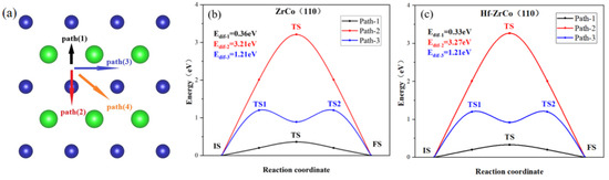 (a) The paths and minimum energy pathway for O diffusion on (b) ZrCo(110) surface and (c) Hf-doped ZrCo(110) surface.