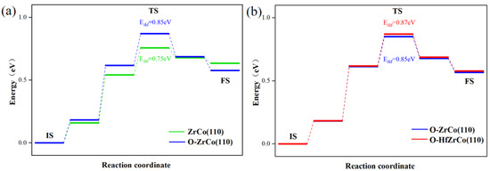 Minimum energy pathway for H inward diffusion on (a) ZrCo(110) and O-adsorbed ZrCo(110) surfaces; (b) O-adsorbed Hf-doped ZrCo(110) surfaces.