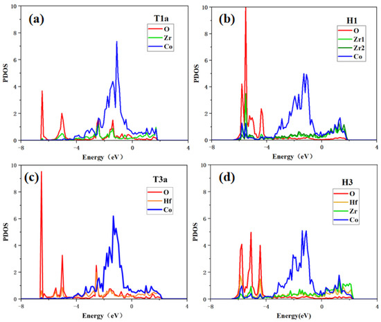As shown in Figure 8, when O2 molecules are adsorbed at the T1a site, O and Zr have high PDOS overlaps in the range of −6.4 eV to 2.0 eV, indicating that there is a strong bonding tendency between O and Zr. While the electrons of the adjacent Co and O have few overlaps, indicating that O tends to bond with Zr rather than Co. For O atom adsorption at the H1 site, the peaks of O and Zr or Co are well overlapped in the range of −6.4 eV to −4.0 eV, which indicates the significant hybridization between the O atom and the adjacent atoms, fitting the lowest adsorption energy shown in Table 3. In addition, it can be found that the O atom unequally interacts with the Zr and Co atoms because the PDOS overlap between O and Zr is larger than that between O and Co atoms. These results show that the bonding of O with Zr at whatever site is stronger than that of O with Co.