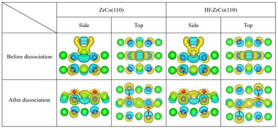 Figure 9 shows the top view and side view of the differential charge density of oxygen molecules on the ZrCo(110) and the Hf-doped ZrCo(110) surfaces before and after dissociation. It can be seen that when O2 molecules are adsorbed at the T1 site on the pure ZrCo(110) surface in molecular form, the two O atoms still exhibit covalent interaction. In addition, there is a larger charge exchange region between O and the adjacent Zr, and O tends to obtain electrons while Zr loses electrons, indicating the strong interaction between O and Zr. When the dissociated O atoms are adsorbed at the H1 site, the charge accumulation region is distributed around the O atoms, and the charge depletion area is distributed among the neighboring two Zr atoms and one Co atom. Therefore, there is a strong interaction between the oxygen atom and its neighboring atoms. The charge accumulation region of O is more inclined towards the Zr atom, indicating that Zr provides more charge to the O atom than Co. Meanwhile, the more charge exchange implies that O adsorption at H1 site is the most stable, which is compatible with the O adsorption behavior analysis results.