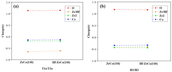 As shown in Figure 10, on the ZrCo(110) surface, when an oxygen molecule is adsorbed at the T1a site, the oxygen molecule can obtain 1.14e from the surface, with 57% of the charge coming from the closely surrounded Zr atoms. This result shows that the interaction between O and Zr is much stronger than that between O and other adjacent atoms. After Hf replaces Zr, Hf provides 53% of the charge to the O atom, indicating that O mainly interacts with the doped Hf instead of the surrounded Zr and Co atoms.