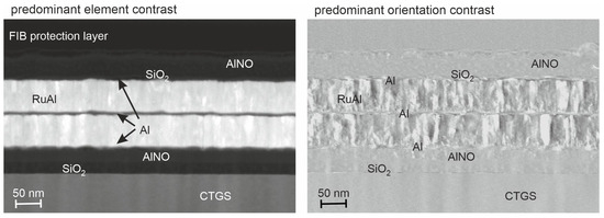The initial microstructure of the as-prepared electrodes is demonstrated in Figure 1 using STEM images with different contrast modes. The image mode using predominant element contrast (Figure 1, left-hand side) allows to distinguish lighter elements, which appear darker in the figures, from heavier elements, which appear brighter. Therefore, oxide layers, as well as pure Al layers, appear darker, while the RuAl layer with the heavy Ru atoms results in a bright contrast. In contrast to this, the image mode with predominant orientation contrast (Figure 1, right-hand side) only hardly depends on the atomic number of the elements; however, instead, it is sensitive to crystallographic lattice planes and therefore allows one to distinguish amorphous regions and crystal grains and allows one to estimate the grain sizes [18]. The multilayer architecture with the two RuAl layers, together with the intermediate, as well as the upper and lower thin pure Al layers, is clearly visible in both images with different contrasts. The image with predominant orientation contrast revealed the presence of columnar grains within the RuAl layers, with a width of up to 20 nm, which are extended across the height of the respective layer.