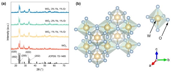 Figure 2. (a) XRD patterns of WO3 and WO3: x mol% Yb3+, 1 mol% Er3+ (x = 1, 2, 3); (b) schematic diagram of the crystal structure of WO3.
