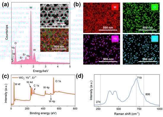 Figure 4. (a) The EDS spectrum of the WO3: 1 mol% Yb3+, 1 mol% Er3+ inverse photonic crystal and the corresponding (b) element mapping images; (c) the full XPS spectrum of the WO3: 1 mol% Yb3+, 1 mol% Er3+ inverse photonic crystal; (d) the Raman spectrum of the WO3: 1 mol% Yb3+, 1 mol% Er3+ inverse photonic crystal.
