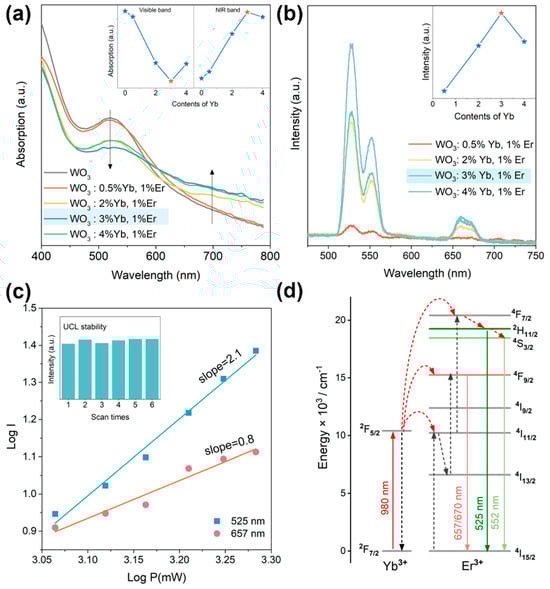 Figure 5. (a) Absorption spectra of WO3 and WO3: x mol% Yb3+, 1 mol% Er3+ (x = 0.5, 2, 3, 4); (b) the UCL spectra of WO3: x mol% Yb3+, 1 mol% Er3+ (x = 0.5, 2, 3, 4) excited at 980 nm; (c) the UCL stability (inset) and logarithmic plot of UCL intensity of WO3: 3 mol% Yb3+, 1 mol% Er3+; (d) diagram of the UCL mechanism of the WO3: Yb3+, Er3+ inverse photonic crystal.