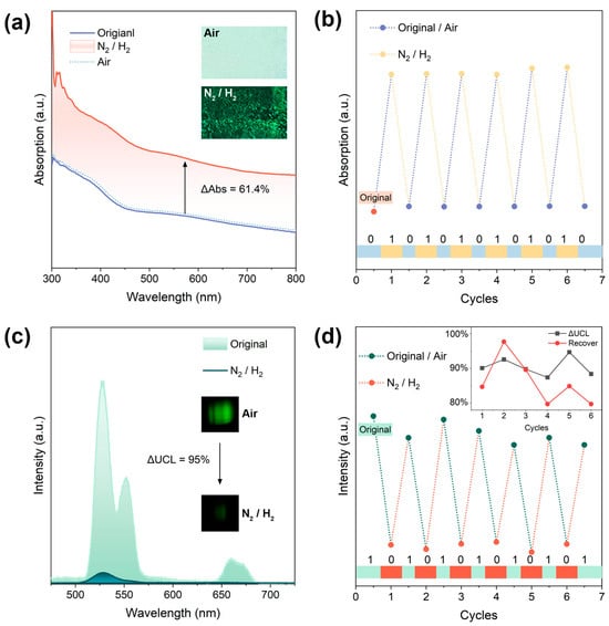 where UCL0 and UCLn represent the UCL intensities of WO3: Yb3+, Er3+ inverse photonic crystals before (light yellow) and after (dark green) heat treatment, respectively. Calculations reveal a ΔUCL value of 95%, demonstrating the exceptional modulation capability of the UCL properties of WO3: Yb3+, Er3+ under different heat treatment atmospheres. Compared to powder materials, WO3: Yb3+, Er3+ inverse photonic crystals have a larger comparative area, which increases their contact area during heat treatment in the N2/H2 reducing atmosphere and air atmosphere, resulting in a higher optical modulation rate that is beneficial for applications such as photocatalysis, optical information storage, and electrochromism. Furthermore, as depicted in Figure 6d, this study demonstrates that the quenched UCL properties of WO3: Yb3+, Er3+ inverse photonic crystals can be effectively restored to their original state through heat treatment in air, enabling a reversible cycle of multiple quenching–restoration events for UCL and thus achieving remarkable luminescent modulation capabilities [36].