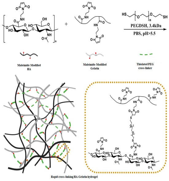 The hydrogel formulation was depicted through schematic representations, illustrating the swift cross-linking reaction with HA-Mal, Gel-Mal, and PEGDSH in PBS. Reprinted with permission from ref. [27]. 2021, MDPI.