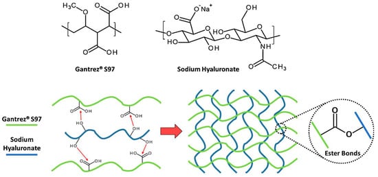 Chemical structures and proposed cross-linking mechanism of Gantrez® S97 and sodium hyaluronate. Reprinted with permission from ref. [29]. 2018, Elsevier.