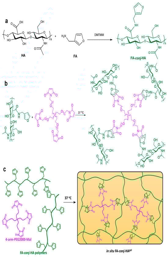 Illustrates the schematic representation of FA-conj-HA gel. The synthesis route of FA-conj-HA polymers is shown in (a), while the cross-linking route of FA-conj-HA gel is depicted in (b). In (c), the FA-conj-HA solution undergoes cross-linking using 4-arm-PEG2000-Mal through a D-A reaction, leading to the creation of viscoelastic hydrogels. Reprinted with permission from ref. [31]. 2024, Elsevier.