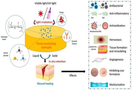The schematic illustrates the design and the impact of photo-cross-linking hydrogels on wound healing. Reprinted with permission from ref. [66]. 2022, MDPI.