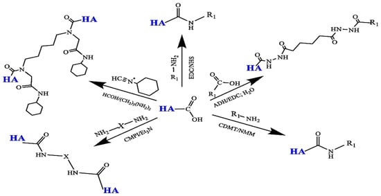 The amidation reactions of the -COOH group in chemical modifications of HA. Reprinted with permission from ref. [36]. 2024, Elsevier.