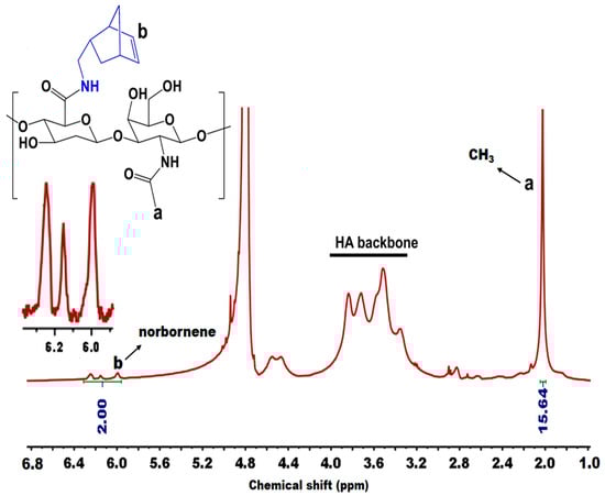 NMR is an invaluable tool for elucidating the structure and makeup of polymers, encompassing the identification of functional groups, monomer sequences, stereochemistry, conformations, and bonding configurations. This aids in the thorough characterization of synthesized polymers [64,81]. 1H NMR plays a pivotal role in the detection and identification of residual monomers, solvents, catalysts, or other impurities within synthesized polymers. The in situ 1H NMR monitoring of reactions facilitates step-by-step observation, offering valuable insights into reaction mechanisms and intermediates during polymer synthesis [63,82]. Jo et al. [83] functionalized HA with 5-norbornene-2-methylamine by employing a carbodiimide coupling reaction using EDC and NHS. The resulting HA-Nb precursor is primed for an IEDDA click reaction. The structure of the synthesized HA-Nb was probed using 1H NMR. The degree of substitution (DS) of Nb was assessed by integrating the protons of the Nb moiety and the methyl protons of the HA moiety. By analyzing the 1H NMR spectrum (Figure 9), the DS of Nb was determined to be 20% based on the integration of the Nb protons from 5.9 to 6.3 ppm and the methyl protons of HA at 2.0 ppm.