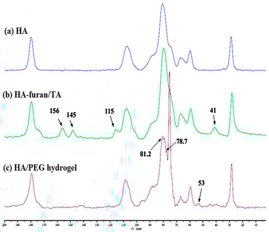 13C-NMR spectra (400 MHz) of (a,b) HA–furan/TA and (c) HA/PEG hydrogel are solid, indicating the presence of both D-A click chemistry and enzymatic cross-linking processes. Reprinted with permission from ref. [86]. 2014, RSC.