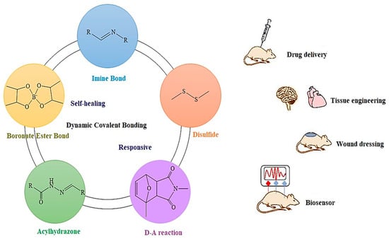 Covalent augmentation refers to a method of enhancing the physical properties of HA through chemical modifications or cross-linking [98]. This process involves introducing chemical changes or cross-linking agents to the HA hydrogel. By incorporating functional groups or reactive molecules into the HA matrix, they can interact and form covalent bonds with each other [99]. These connections between the HA chains improve the mechanical characteristics of the hydrogel, such as its strength, elasticity, and stability [100]. For instance, by using cross-linking agents like polyethylene glycol diacrylate (PEGDA) in the presence of a radical initiator, the mechanical properties of the hydrogel can be enhanced [42,101]. Another related study by Loebel et al. [102] explored creating a self-healing hydrogel for the controlled release of therapeutic agents by modifying HA with β-cyclodextrin and adamantine. The prepared hydrogel acted like a polymer melt when passed through a syringe, demonstrating shear thinning properties where viscosity was reduced. Additionally, after removing the shear forces, the hydrogel was able to reassemble and self-heal, with viscosity returning to its original value. To enable secondary cross-linking, HA-based polymers were further modified with methacrylate groups. This modified hydrogel showed the ability to flow when mechanical forces were applied but rapidly self-heal and regain viscosity once forces were removed, making it promising for applications requiring the controlled release of proteins and growth factors [103]. This approach allows researchers and engineers to customize the physical attributes of the HA hydrogel for specific applications. For example, covalent augmentation can elevate the load-bearing capacity of HA hydrogel for tissue engineering scaffolds [104] or enhance its viscosity for controlled drug delivery systems. Meanwhile, the modified hydrogel retains its inherent biological properties while offering improved mechanical features. Overall, the covalent augmentation of HA hydrogels holds great promise in optimizing their physical properties and expanding their potential applications in various fields of biomedicine and biomaterials [99]. Ye et al. conducted a comprehensive review of hydrogels that utilize dynamic covalent bonding, with a focus on their promising potential for biomedical applications, which is shown in Figure 12 [105].