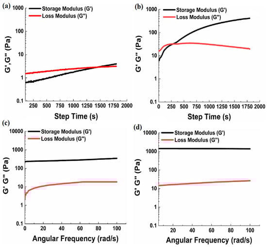 The moduli of HA/Coumarin-25 and HA/Coumarin-100 hydrogels were measured in two ways. Firstly, their moduli were measured as a function of step time (a,b), and secondly, their moduli were measured as a function of angular frequency (c,d). Reprinted with permission from ref. [64]. 2023, Elsevier.