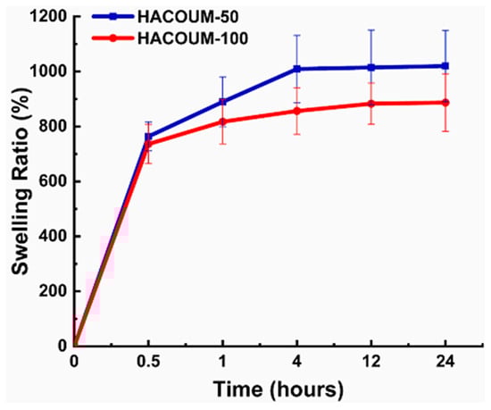 Swelling studies are conducted to evaluate the water absorption and retention capabilities of HA hydrogels [123]. When HA hydrogels come into contact with an aqueous environment, they absorb water and undergo expansion or swelling [124]. Multiple factors influence the swelling behavior, such as the molecular weight and concentration of HA, cross-linking density [125], pH [126], temperature [127], and the presence of ions. The behavior of HA hydrogels is also affected by pH and temperature. pH variations can impact the ionization state of HA, affecting its hydrophilicity and swelling capacity. Changes in temperature can influence the kinetic energy of water molecules, affecting their movement within the hydrogel network and consequently influencing the swelling behavior [128]. Cross-linking density significantly contributes to the swelling behavior of HA hydrogels. A higher cross-linking density restricts the motion of polymer chains, resulting in reduced swelling capacity. On the other hand, a lower cross-linking density enables increased water absorption, leading to enhanced swelling [129]. The swelling ratios of hydrogels are shown in Figure 14. Both of the tested hydrogels swelled dynamically during the initial first hour. This initial rapid swelling could be due to the porous or sponge-like structures of the hydrogels, which facilitated the diffusing of water molecules into the hydrogels, as Gulfam et al. reported previously [64].