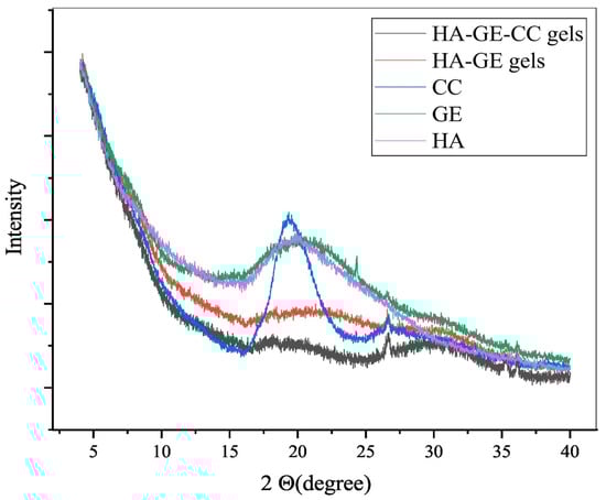 On the other hand, TEM [133] is employed to investigate the internal structure of HA hydrogels at higher magnifications. It provides detailed information regarding the arrangement, distribution, and possible presence of internal structures or particles within the gel matrix. AFM [134], operating at the nanoscale, allows for the imaging of surface morphology and topography and offers insights into properties such as surface roughness, gel structure, and interactions with other materials. XRD [135] is capable of analyzing the crystallographic structure of HA hydrogels, providing valuable data about the composition of crystalline and amorphous phases present in the gel matrix. Yang and colleagues investigated the use of carboxymethyl chitosan microsphere-loaded HA/gelatin hydrogels for controlled drug delivery. They analyzed the XRD patterns of HA, gelatin, carboxymethyl chitosan, and hydrogels within the 2θ range of 2–40°, as depicted in Figure 16. The XRD profile of gelatin and carboxymethyl chitosan polymers showed a broad peak at 20°. The XRD scanning of gelatin revealed a wide diffraction peak near the 2θ of 21°, indicating its amorphous nature. However, the crystal structure of HA and gelatin was disrupted after the preparation of the composite gel, demonstrating the cross-linking reaction between HA and gelatin [79].