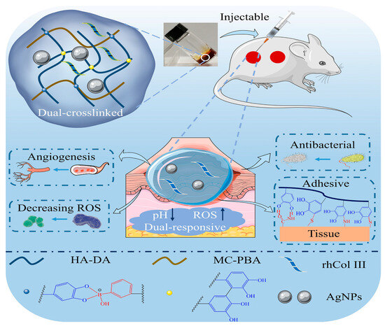 - Wang, Y.; Zhang, Y.; Yang, Y.-P.; Jin, M.-Y.; Huang, S.; Zhuang, Z.-M.; Zhang, T.; Cao, L.-L.; Lin, X.-Y.; Chen, J.; et al. Versatile Dopamine-Functionalized Hyaluronic Acid-Recombinant Human Collagen Hydrogel Promoting Diabetic Wound Healing via Inflammation Control and Vascularization Tissue Regeneration. Bioact. Mater. 2024, 35, 330–345. [Google Scholar] [CrossRef] [PubMed]