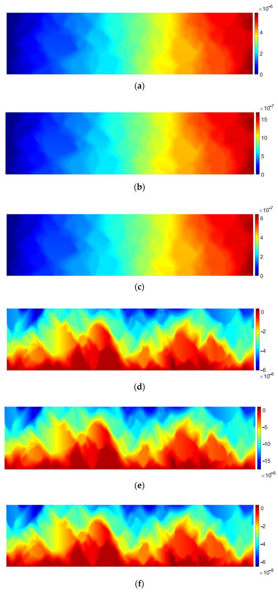 - Application of the linear shape functions to approximate the solution within each triangular element implies that strains are constant within whole element (due to constant shape function derivatives)—consequently, numerical integration over the finite elements is also very fast (see Equation (3));