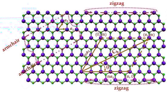Boron nitride, aluminium nitride, gallium nitride, indium nitride, and thallium nitride sheets have a hexagonal lattice, where the atom that is part of the 13th group of the periodic table (now designated A13), such as boron (B), aluminium (Al), gallium (Ga), indium (In), or thallium (Tl), form with nitrogen (N) into a honeycomb structure. For all nitride compounds under study, the hexagonal lattice has planar geometry [,], as shown for the case of the GaN nanosheet in Figure 1. The honeycomb atomic arrangement is defined by the chiral vector, Ch, and the chiral angle, θ, expressed as follows, respectively: