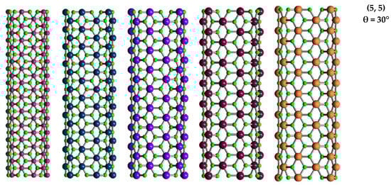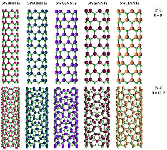 Structures of (7, 0) zigzag, (8, 4) chiral and (5, 5) armchair of SWBNNTs, SWAlNNTs, SWGaNNTs, SWInNNTs, and SWTlNNTs, acquired using Nanotube Modeler© software (version 1.8.0, ©JCrystalSoft, http://www.jcrystal.com, 1 March 2024). N atoms are depicted in green, and B atoms are depicted in bright pink, Al atoms are in blue, Ga atoms are in purple, In atoms are in dark red, and Tl atoms are in pale orange.