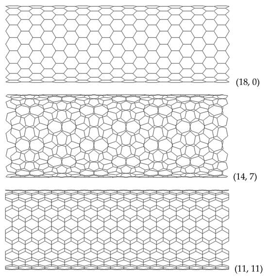 The FE meshes of SWBNNTs, SWAlNNTs, SWGaNNTs, SWInNNTs, and SWTlNNTs used in the FE analysis were built utilizing the Nanotube Modeler© software. The program database files acquired from this software were converted to the format supported by the ABAQUS® code (Abaqus 2020, Dassault Systèmes®). The in-house program InterfaceNanotubes.NM [] was used for this purpose. FE meshes for zigzag, chiral, and armchair InNNTs are exemplified in Figure 3.