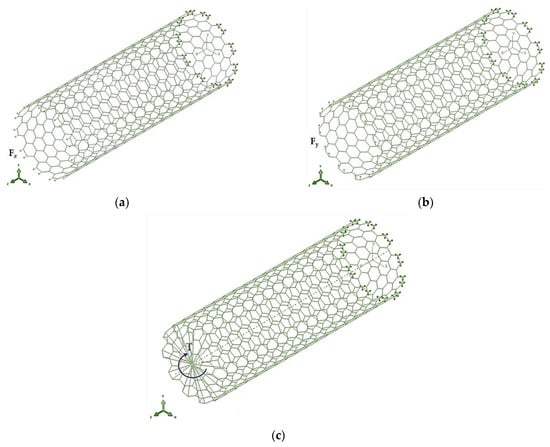 Boundary and loading conditions applied in tests of (a) tension, (b) bending, and (c) torsion of armchair SWInNNTs.