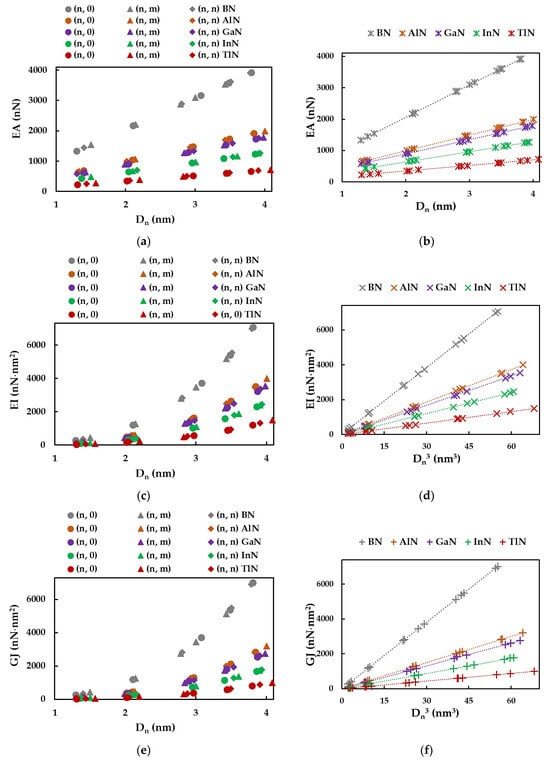 The tensile, bending, and torsional (EA, EI, and GJ) rigidities of the SWBNNTs, SWAlNNTs, SWGaNNTs, SWInNNTs, and SWTlNNTs, calculated by Equations (8)–(10) from the FEA results, are plotted as a function of the nanotube diameter  in Figure 5a,c,e. For each of the three rigidities, the same trend is observed with the increase in the nanotube diameter regardless of the NTs symmetry group (zigzag, chiral, or armchair) and nanotube compound. It is worth mentioning that the EA, EI, and GJ rigidities decrease from the values obtained for SWBNNTs to those for SWTlNNTs. As previously established for the phosphide [] and carbide [,] nanotubes, in the case of the 13th group element-nitride NTs, the tensile rigidity EA can be described by a linear function of  (Figure 5a,b), while the bending EI and torsional GJ rigidities can be described by a linear function of  (Figure 5c–f).