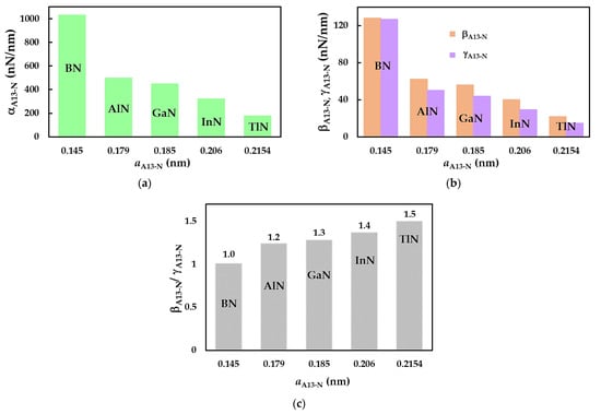 The fitting parameters , , and  in Table 5 allow for the quantification of the tensile, bending, and torsional rigidities, respectively, thereby describing the mechanical response of nanotubes under tension, bending, and torsion. To this end, the values of  and , together with , are presented in Figure 6a and 6b, respectively, for the bond lengths, , corresponding to the SWBNNTs, SWAlNNTs, SWGaNNTs, SWInNNTs, and SWTlNNTs. All three fitting parameters drop from SWBNNTs to SWAlNNTs; then, the , , and  values decrease gradually when moving to SWTlNNTs, i.e., as the  value increases (see Figure 6a,b). With respect to the relationship between bending EI and torsional GJ rigidities, which can be defined by the ratio between the respective fitting parameters  and , the ratio is / ≈ 1 for the SWBNNTs (see Figure 6c). It suggests that in this case, the EI and GJ rigidities are practically identical. For the remaining cases, the ratio of / becomes nearly equal to 1.2 for the SWAlNNTs and continues increasing in increments of 0.1 up to / ≈ 1.5 for the SWTlNNTs. As seen in Figure 6c, increasing the bond length  leads to a decrease in torsional rigidity and, subsequently, to the more significant difference between the EI and GJ rigidities. It can be concluded that the SWInNNTs and SWTlNNTs with longer bond lengths,  = 0.206 nm and  = 0.215 nm, respectively, have weaker torsional properties when compared with those of the other 13th group atom-nitride NTs.