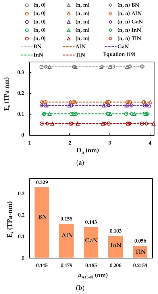 Figure 7a displays the evolutions of the surface Young’s modulus, , assessed by Equation (14) with the NT diameter, , for all single-walled nitride nanotubes studied. The results of  calculated by Equation (19) are also plotted in Figure 7a by dashed lines. For the 13th group-nitride NTs, regardless of the chiral angle (zigzag, chiral, or armchair NTs) as well the compound (BN, AlN, GaN, InN, or TlN), the surface Young’s modulus is quasi-constant with increasing NTs diameter through the range of  considered in the current work. It can be concluded from Figure 7a that Equation (19) permits an accurate evaluation of the surface Young’s modulus of nitride nanotubes. In fact, the mean differences between the values of  evaluated with the aid of analytical Equation (19) and those determined from the FEA by Equation (14) are 0.18%, 0.08%, 0.10%, 0.12%, and 0.17% for the SWBNNTs, SWAlNNTs, SWGaNNTs, SWInNNTs, and SWTlNNTs, respectively. As a result, the elastic properties of the nitride NTs can be accurately evaluated without resorting to numerical simulation. To examine the influence of the first element (B, Al, Ga, In, Tl) of the nitride compound, which forms the nanotube on the surface Young’s modulus results, the  values assessed by Equation (19) are plotted in Figure 7b considering the respective bond lengths .