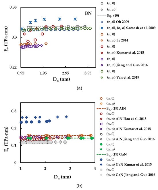 Figure 8 compares the surface Young’s modulus, , values obtained for SWBNNTs (Figure 8a) and SWAlNNTs and SWGaNNTs (Figure 8b) with those available in the literature. A comprehensive comparison of the Young’s modulus results of SWBNNTs with the literature was carried out in a previous work by the authors [], and therefore, only a few selected  values were currently chosen. The  results of Hao et al. [], Kumar et al. [], Santosh et al. [], Oh [], and Yan et al. [] were assessed based on the Young’s modulus E by the equality  for NT wall thickness  = 0.333 nm [], 0.340 nm [], 0.330 nm [,], and 0.410 nm [].