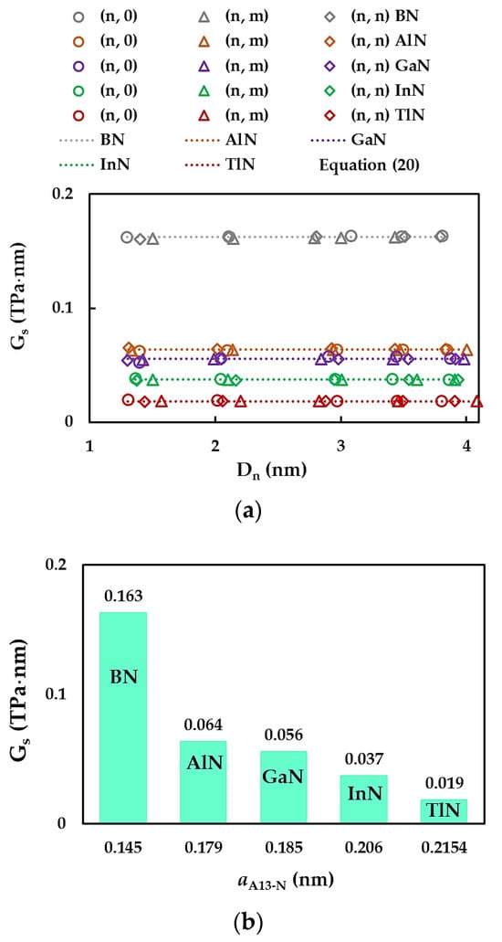 The surface shear modulus, , of the SWBNNTs, SWAlNNTs, SWGaNNTs, SWInNNTs, and SWTlNNTs was evaluated by Equation (15), which makes use of the results of the numerical tensile, bending, and torsional tests. Also, by substituting in Equation (15) the EA, EI, and GJ rigidities given by expressions (16)–(18), and with knowledge of the fitting parameters, , , and , from Table 5,  can be assessed by the following analytical expression: