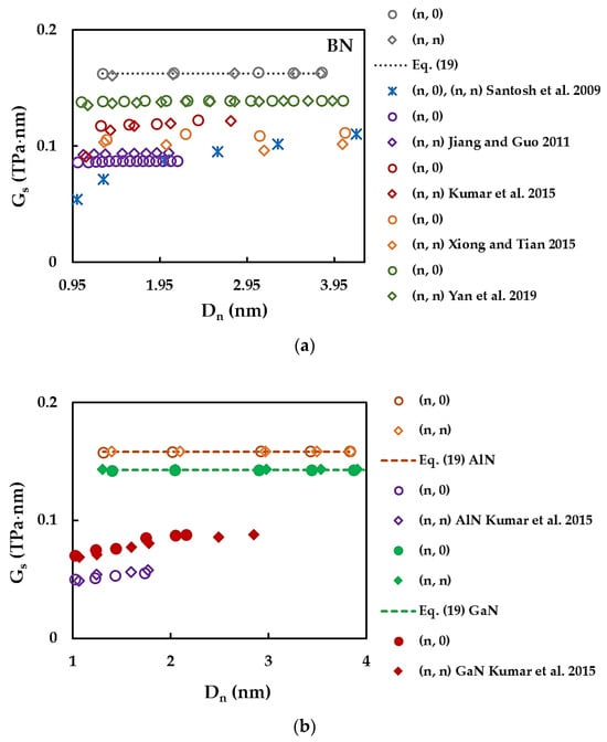 The  results available in the literature are scarce, even for the case of SWBNNTs, and show considerable discrepancy, as seen in Figure 10a,b. Xiong and Tian [], Kumar et al. [], Santosh et al. [], and Yan et al. [] reported shear modulus G values. To enable a comparison, the respective surface shear modulus was calculated by using  for an NT wall thickness of  = 0.330 nm [], 0.333 nm [], and 0.340 nm []. Xiong and Tian [] did not report any  value, so in this case,  = 0.34 nm [] was used.