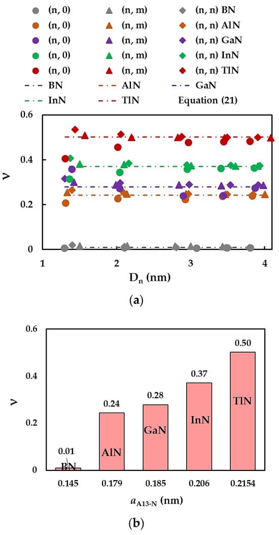 Figure 11a demonstrates the evolution of the Poisson’s ratio, ν, assessed by Equation (13), with the NT diameter, , for the SWBNNTs, SWAlNNTs, SWGaNNTs, SWInNNTs, and SWTlNNTs in Table 3. The values of ν calculated by Equation (21) are also presented in Figure 11a. For zigzag, chiral, and armchair nitride NTs with a high value of , ν converges to the constant value obtained using Equation (21). The higher the value of the bond length , the bigger the nanotube diameter  for which ν becomes stable (see Figure 11a). The  values are approximately 1.4 nm, 2.0 nm, 2.1 nm, 3.0 nm, and 3,4 nm for SWBNNTs, SWAlNNTs, SWGaNNTs, SWInNNTs, and SWTlNNTs, respectively. Similar qualitative results were reported for 13th group element-phosphide nanotubes []. For nitride NTs with diameters of  < , the Poisson’s ratio increases for (n, 0) zigzag NTs, almost does not change for (n, m) chiral NTs, and decreases for (n, n) armchair NTs.