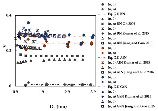 Figure 12 compares the current Poisson’s ratio values with those available in the literature for the cases of SWBNNTs, SWAlNNTs, and SWGaNNTs. A good concordance, with a difference of ≈2%, is found when the ν value calculated by Equation (21) for SWGaNNTs is compared with that reported by Jiang and Guo [] for the non-chiral GaN nanotubes. The Poisson’s ratios evaluated by Kumar et al. [] for (n, 0) and (n, n) GaNNTs are ≈8% lower and ≈6% higher, respectively, than the ν values currently obtained. In other cases presented in Figure 12, there is a considerable scattering of the ν values.