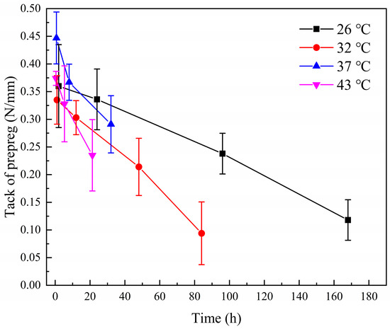 The tack of T-prepregs at different aging temperatures decays with handling life unit.