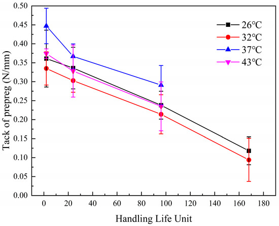 In order to establish a relationship between the change in tack value of the prepregs and time, the magnitude of the decrease in tack for one hour of aging at 26 °C/65% RH was recorded as a unit of handling life. A 26 °C/65% RH meets the environmental conditions of most composite material workshops. Using the unit of handling life as the horizontal coordinate, the curve of tack change with the unit of handling life is plotted. Figure 6 shows the change in tack of T-type prepregs with handling life unit. The four curves in the figure show the same slope, which indicates that when the handling life unit is the horizontal coordinate, the tack decay at different temperatures shows the same law. The unit of handling life allows the composite manufacturer to translate the available tack range of the prepreg into the maximum operating downtime at 26 °C/65% RH. Even if the prepreg is subjected to complex temperature aging during downtime or transport, the remaining handling life can be determined by measuring the difference between the tack of the prepreg and the minimum tack permitted for production. The handling life unit establishes a relationship between tack and remaining shelf life and reduces the cost of managing prepregs for manufacturers.