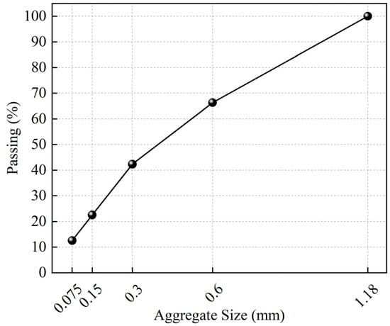 The limestone aggregates and fillers used in this study were from Yuzhou, whose basic properties are presented in Table 3 according to JTG E42-2005 [], and the gradation of aggregates used in the FAM mixtures is as shown in Figure 1. The detailed steps of the design methodology for rock asphalt FAM mixes can be found in Li et al. [].