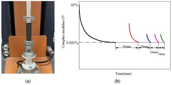 The creep test on FAM specimens was first carried out with a stress amplitude of 10 kPa for 20 s at 25 °C using the Dynamic Shear Rheometer (DSR). After the creep test, the specimen was allowed to recover for 20 min without an external load being applied. Subsequently, the specimen underwent a 90-second time-sweep test at 25 °C with a strain amplitude of 0.006% and a frequency of 5 Hz. After the linear viscoelasticity tests above were completed, the specimen was allowed to heal for 20 min under 25 °C conditions. Then, the specimen was subjected to fatigue-healing tests in stress-controlled mode. First, the specimen was sheared at a frequency of 5 Hz until the dynamic shear modulus |G*| decreased to 60%|G*|0. At this moment, a 40-minute rest break was established. Following the rest period, loading was continued until the specimen’s modulus decayed to 60%|G*|0, and another 20-minute rest period was introduced thereafter. By analogy, the process was repeated, except that the subsequent rest periods are 10 min and 5 min in length, respectively. The details of this procedure can be found in Karki et al. [] and Li et al. []. The DSR with the cylindrical FAM specimen is as shown in Figure 3a, and the detailed test schematic is as shown in Figure 3b.