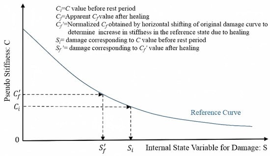 where HI represents healing index, %; Si represents the cumulative damage parameter prior to the rest period; and Sf′ represents the damage parameter corresponding to the normalized pseudo stiffness Cf′ after self-healing. Figure 4 illustrates the calculation of the damage parameter S using the reference C(S) curve.