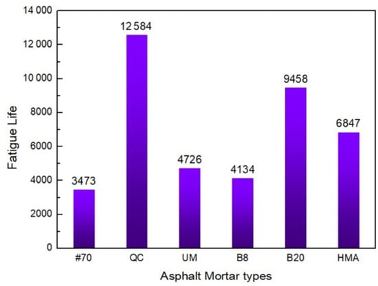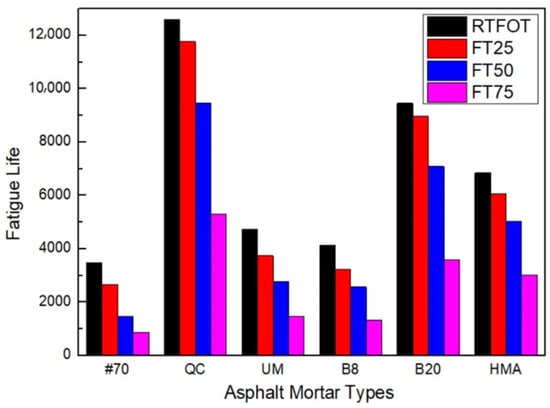 Figure 11 shows that the fatigue life of all asphalt FAM mixtures decreased after freeze–thaw. This is attributed to the expansion stress, internal stress, and temperature stress generated by the expansion and melting of ice, which disrupt the structure of the FAM mixture []. The fatigue life of the #70 asphalt FAM mixture decreased mostly by 76% after 75 freeze–thaw cycles, significantly higher than that of the rock asphalt FAM mixtures. With an identical quantity of freeze–thaw cycles, the fatigue life of the UM rock asphalt FAM mixture decreased the fastest, while the fatigue life of the QC rock asphalt FAM mixture decreased the slowest. The fatigue life of 8% and 20% Buton rock asphalt FAM mixtures was reduced by 22% and 5% when the freeze–thaw cycles increased from 0 to 25. This indicates that freezing and thawing had the greatest effect on the fatigue properties of the #70 asphalt FAM mixture, and the effect on the rock asphalt FAM mixture was ranked as follows: UM > Buton > QC. For the same species of rock asphalt, the impact of freezing and thawing on the fatigue properties of the rock asphalt FAM mixture decreased as the doping level increased. After 25 freeze–thaw cycles, the fatigue life of the HMA FAM mixture was reduced by 11%. Its effect on the fatigue performance of the HMA FMA mixture was in the middle between the UM rock asphalt FAM mixture and the QC rock asphalt FAM mixture as compared to other varieties of rock asphalt FAM mixture.